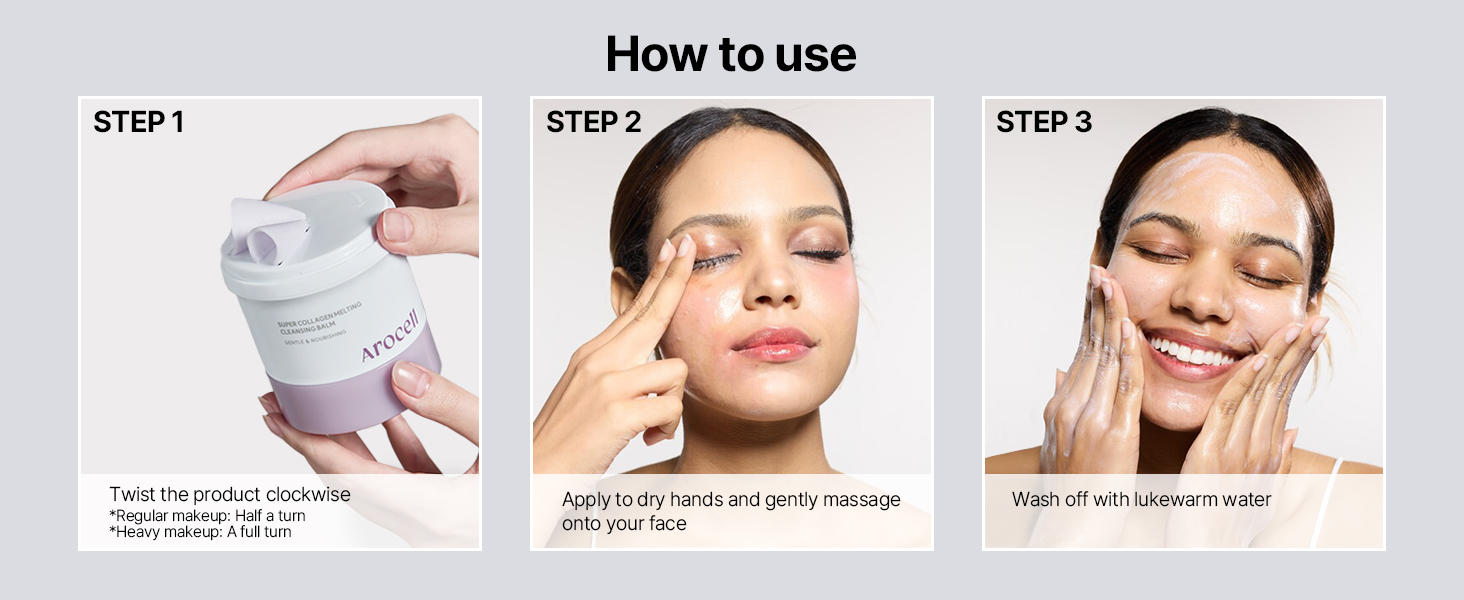 For light cleansing, half a turn. For heavy makeup, a full turn. The balm is temperature-sensitive, so close the lid tightly after use.